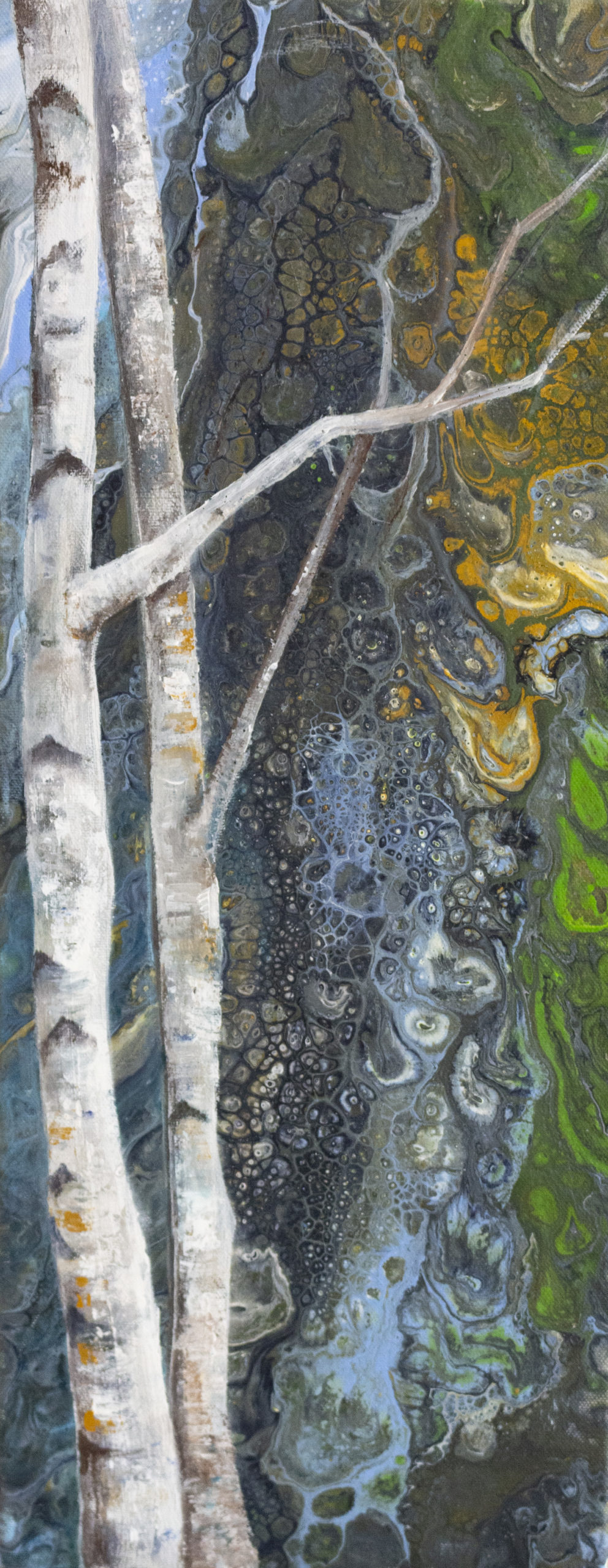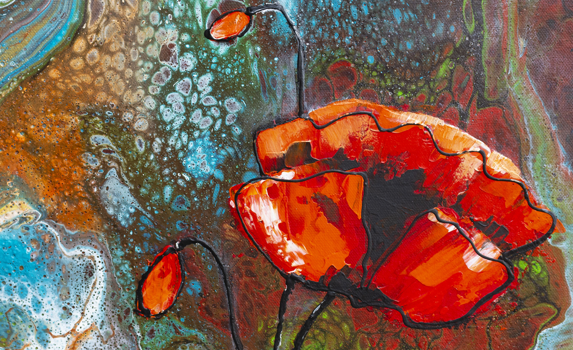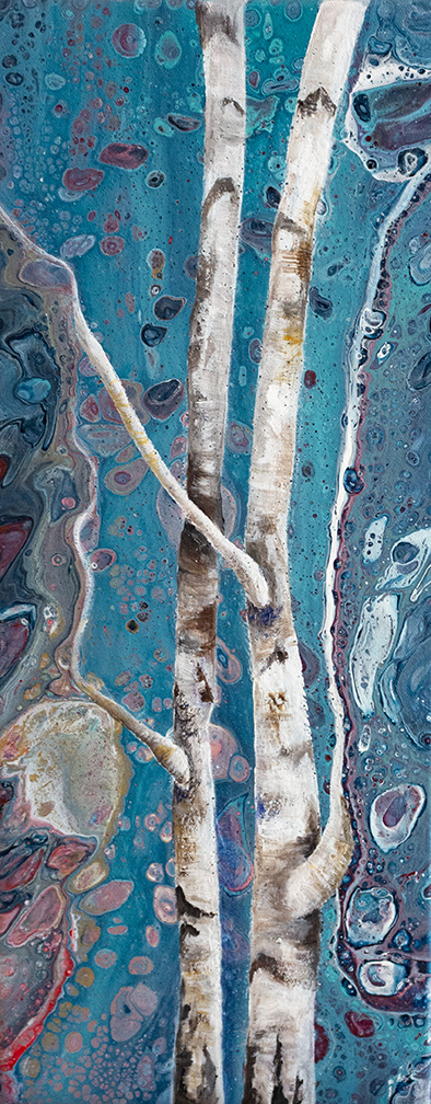 In de workshop Creatief ná het Acryl gieten gaan we hiermee aan de slag. Afhankelijk van je oorspronkelijke kunstwerk kies je een onderwerp. Dit kunnen bijvoorbeeld heel mooi Berkenbomen zijn, maar ook klaprozen zijn heel fraai op een ‘giet’ achtergrond. Als je gebruikt maakt van de kleuren en de sfeer die al aanwezig zijn in je oorspronkelijke schilderij ontstaat er een prachtig resultaat. En ook hier geldt weer: Dankzij de professionele begeleiding gaat het je zeker lukken en zul je wederom trots zijn op het resultaat. Enkele voorbeelden: